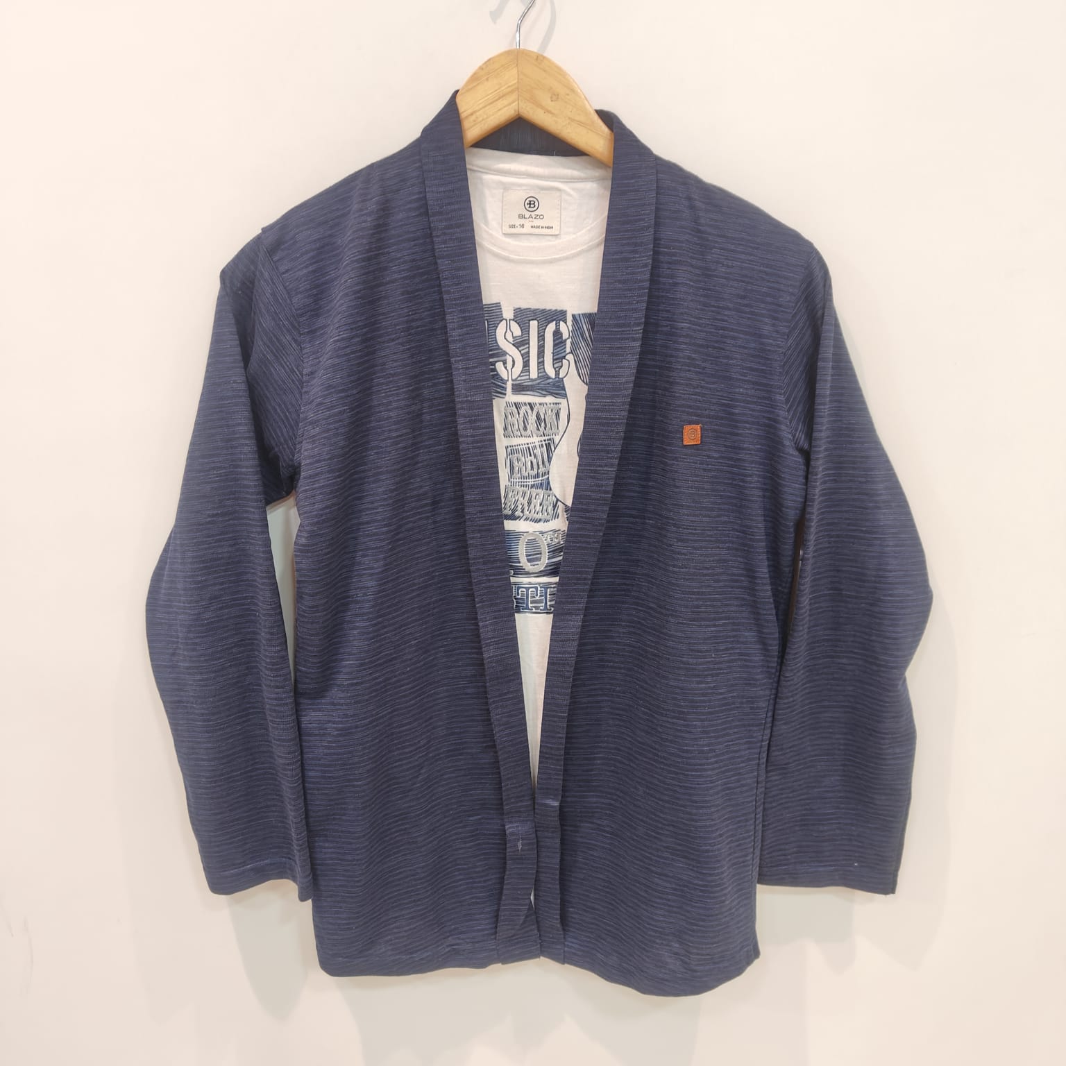 Upgrade your boy’s wardrobe with this Boys Casual Open Front Cardigan Set, a perfect blend of comfort and contemporary fashion. This stylish outfit features a textured blue long-sleeve shrug paired with a trendy printed inner T-shirt, creating a layered look that stands out effortlessly.