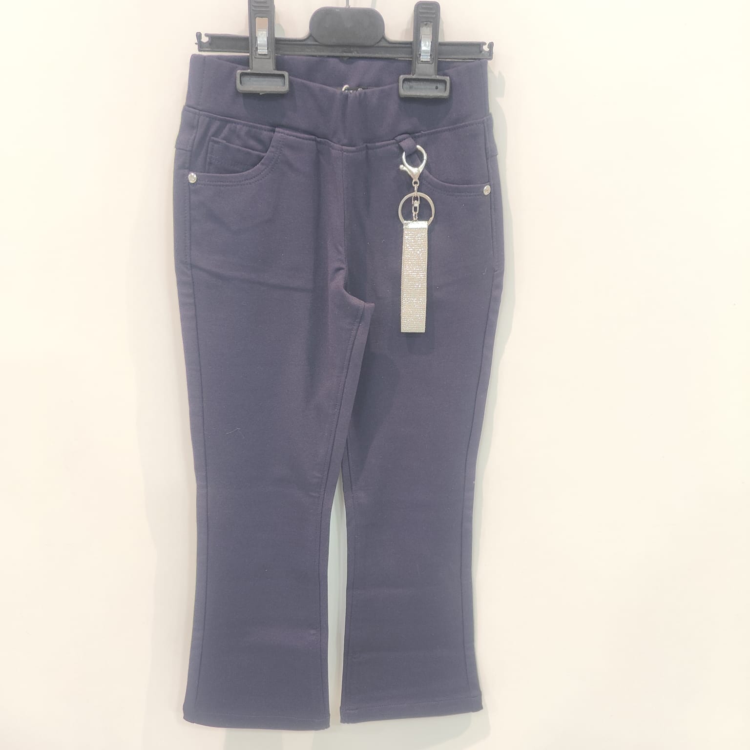 Comfortable navy blue pants for kids featuring a soft stretch fit and fashionable hanging keychain detail.