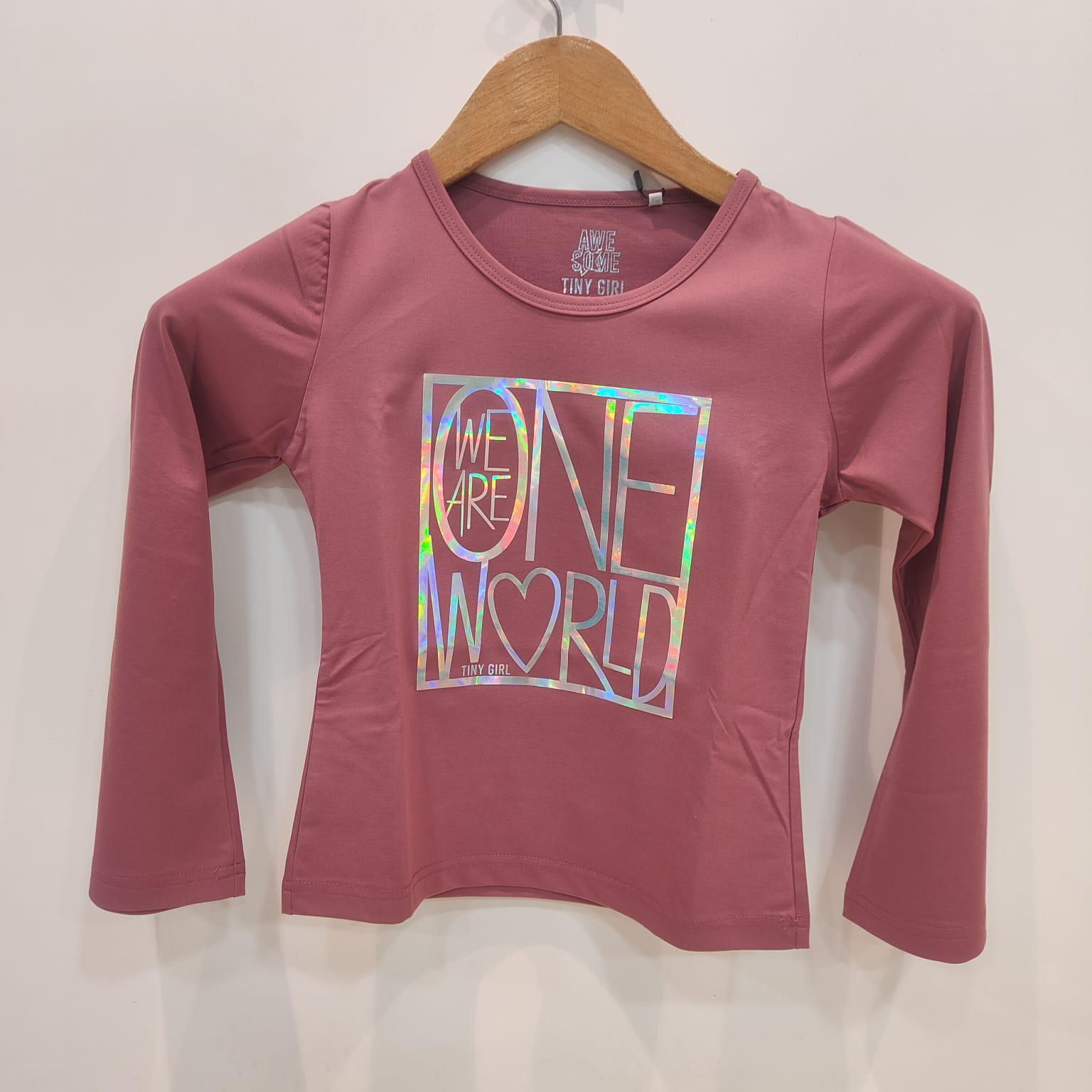 Add sparkle and positivity to your child’s wardrobe with this beautiful pink girls full-sleeve top, designed with a modern holographic “ONE WORLD” print that stands out effortlessly. Crafted from soft, breathable fabric, this top ensures all-day comfort while keeping your child stylish.