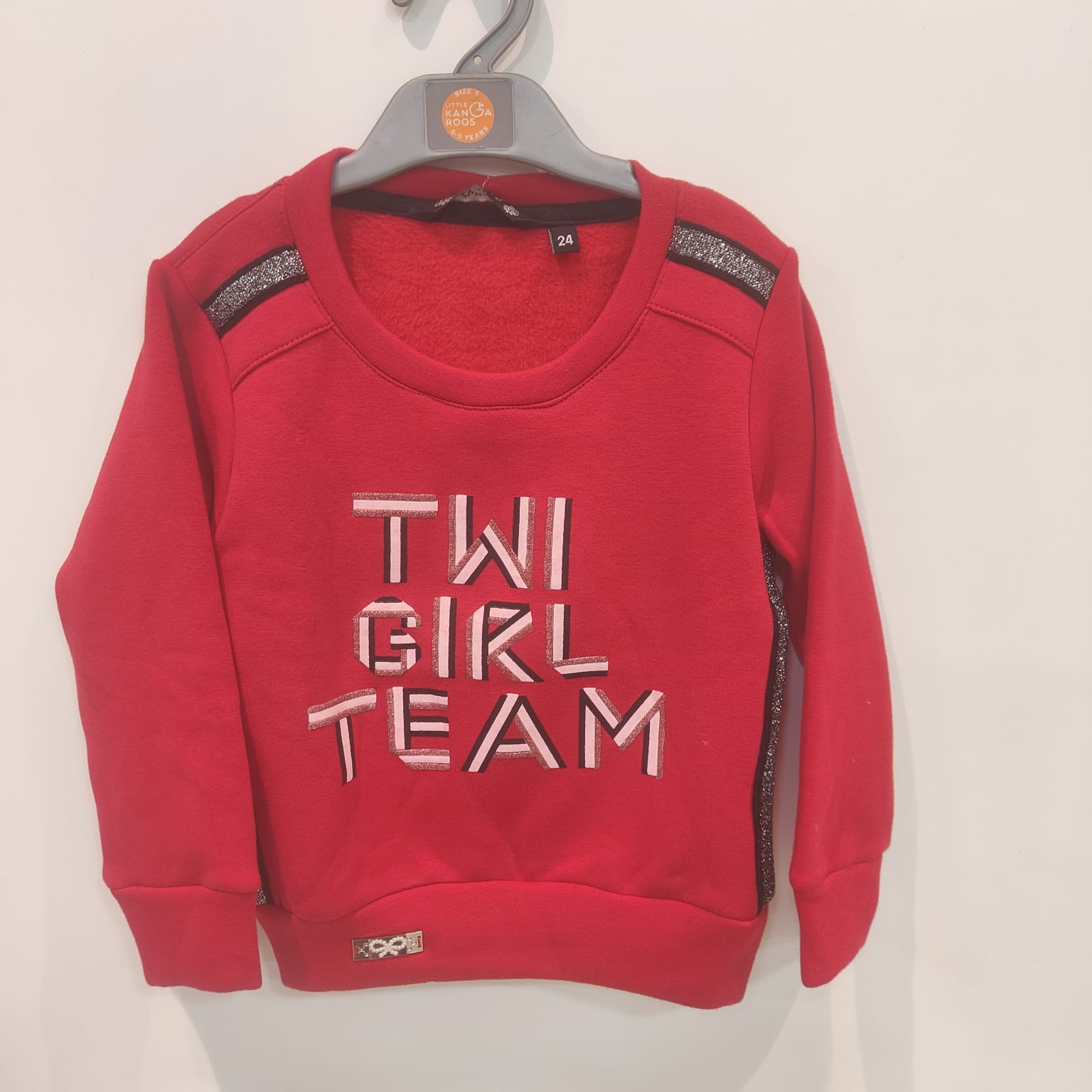 The modern “Twin Girl Team” printed design adds a confident and playful vibe, while the glitter strip detailing on the shoulders and sides enhances its stylish appeal. Featuring a comfortable round neck, full sleeves, and ribbed cuffs and hem, it ensures a snug fit without restricting movement.