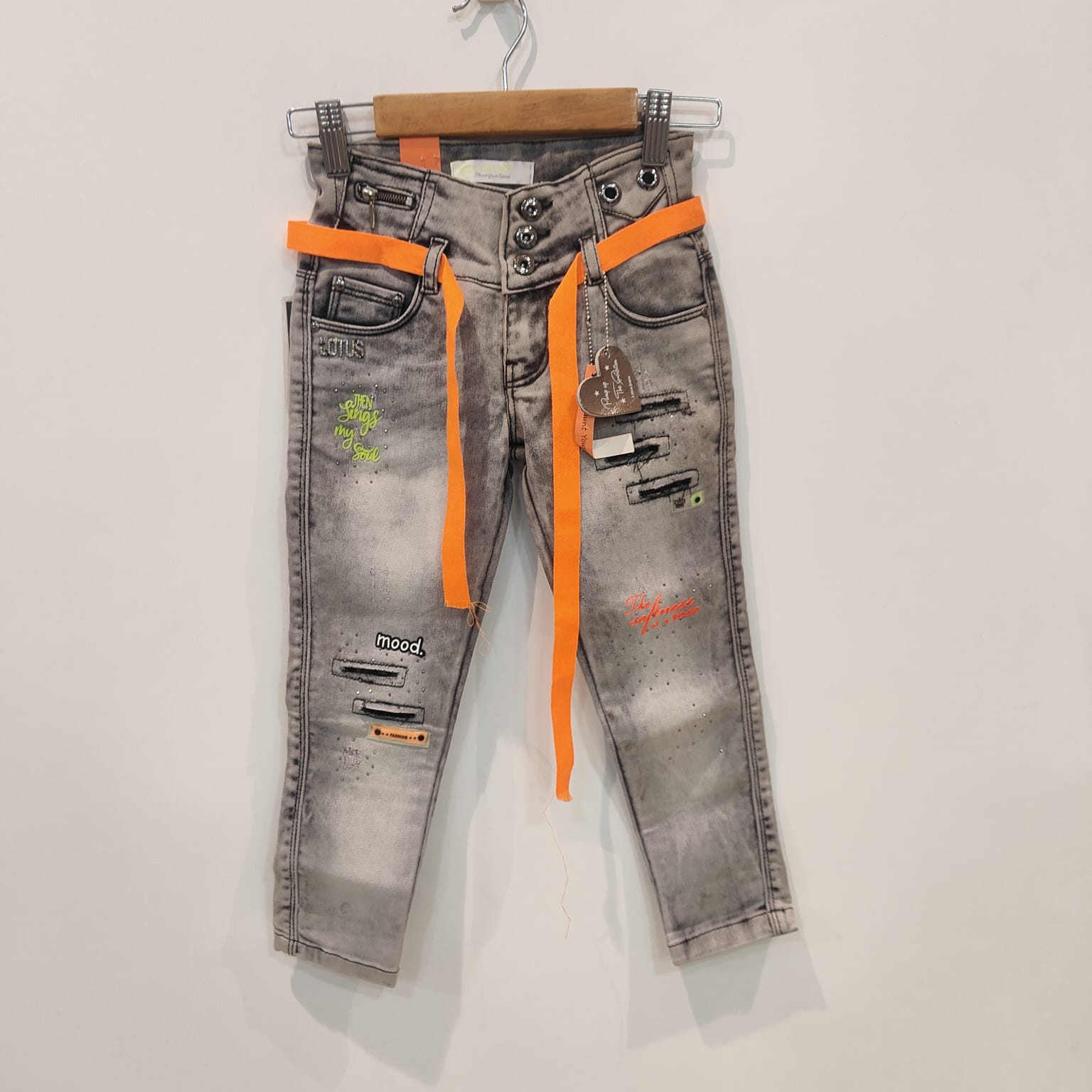 Trendy grey washed kids denim jeans with bold orange belt straps, graphic prints, and slim fit design. Perfect for casual wear, parties, and modern street style looks.
