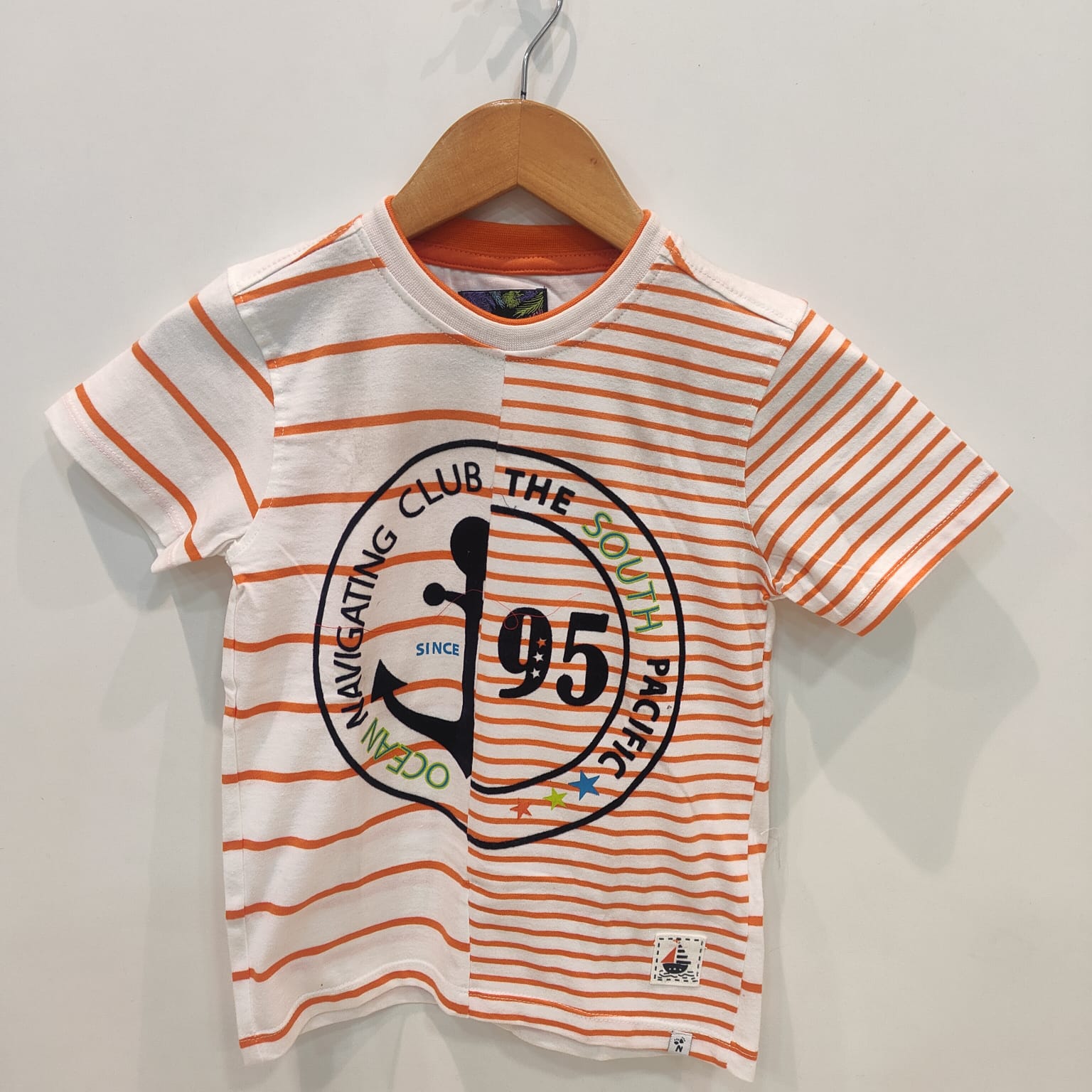 Add a fresh and playful vibe to your child’s wardrobe with this Kids White & Orange Striped T-Shirt. Designed with a unique split striped pattern and an attractive nautical-inspired graphic print, this T-shirt offers a stylish and cheerful look for everyday wear.