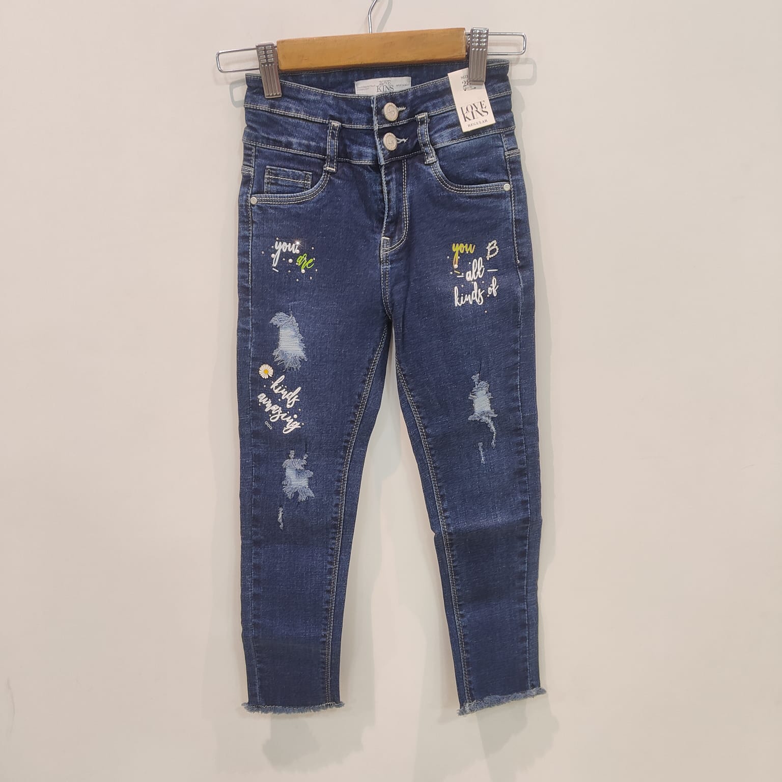 Make your outfit speak louder with these Kindness Graphic Distressed Skinny Jeans — where fashion meets positivity. Designed in a rich mid-blue wash, these jeans feature uplifting printed phrases and playful artwork that add personality and charm to your everyday wardrobe.