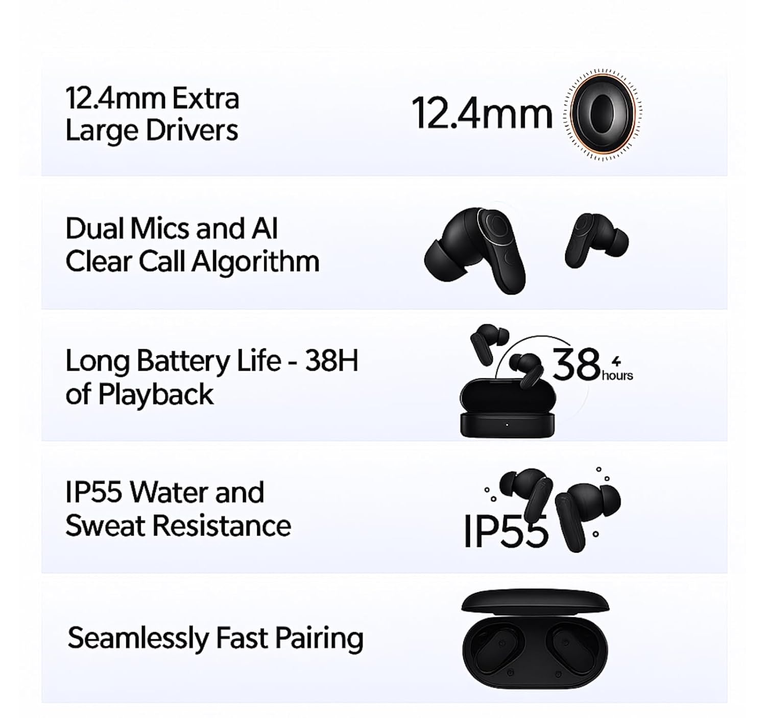 - [Enhanced Sound Experience]: The buds comes with 12.4mm driver unit, which delivers crisp clear and enhanced bass quality sound experience