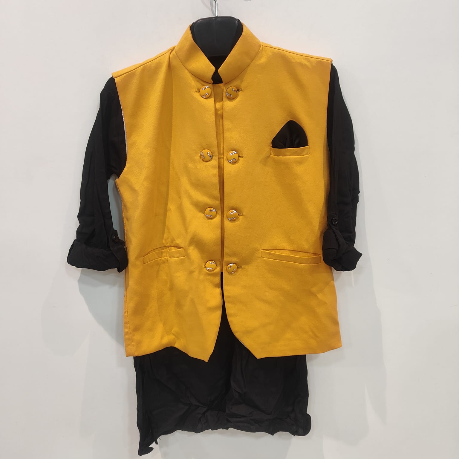 Make your little one shine at every celebration with this royal kids Nehru jacket and kurta set, crafted for timeless ethnic elegance. The rich mustard sleeveless jacket features a mandarin collar, decorative metallic buttons, and a stylish pocket square, beautifully paired with a classic black kurta for a bold and sophisticated contrast.