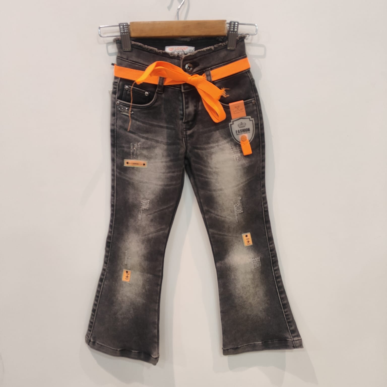 The standout feature? A vibrant neon orange belt that adds a pop of color and modern street-style energy. The mid-rise fit flatters the waist, while the flared bootcut hem elongates the legs and adds a retro-inspired silhouette that’s back in style.
